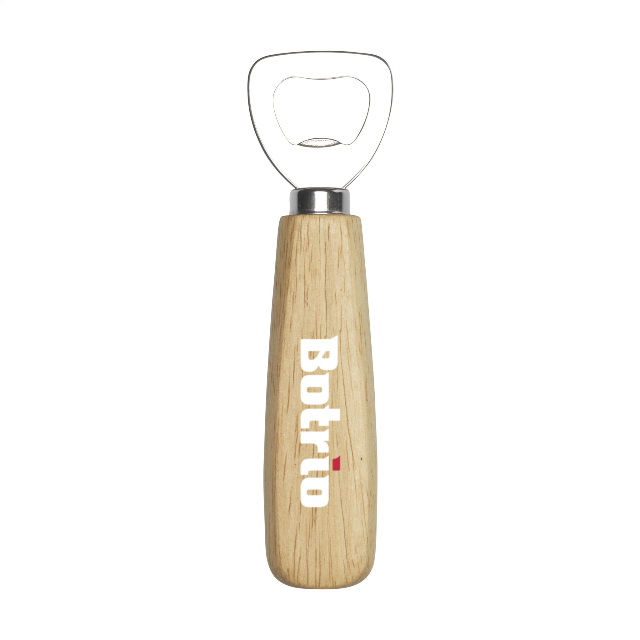 Slitstark flasköppnare med bokträhandtag. Designad för enkel användning.