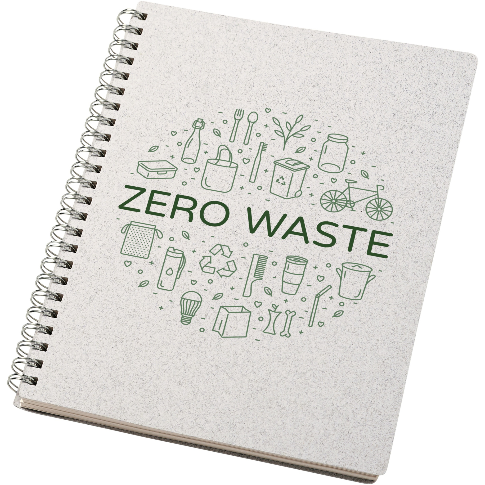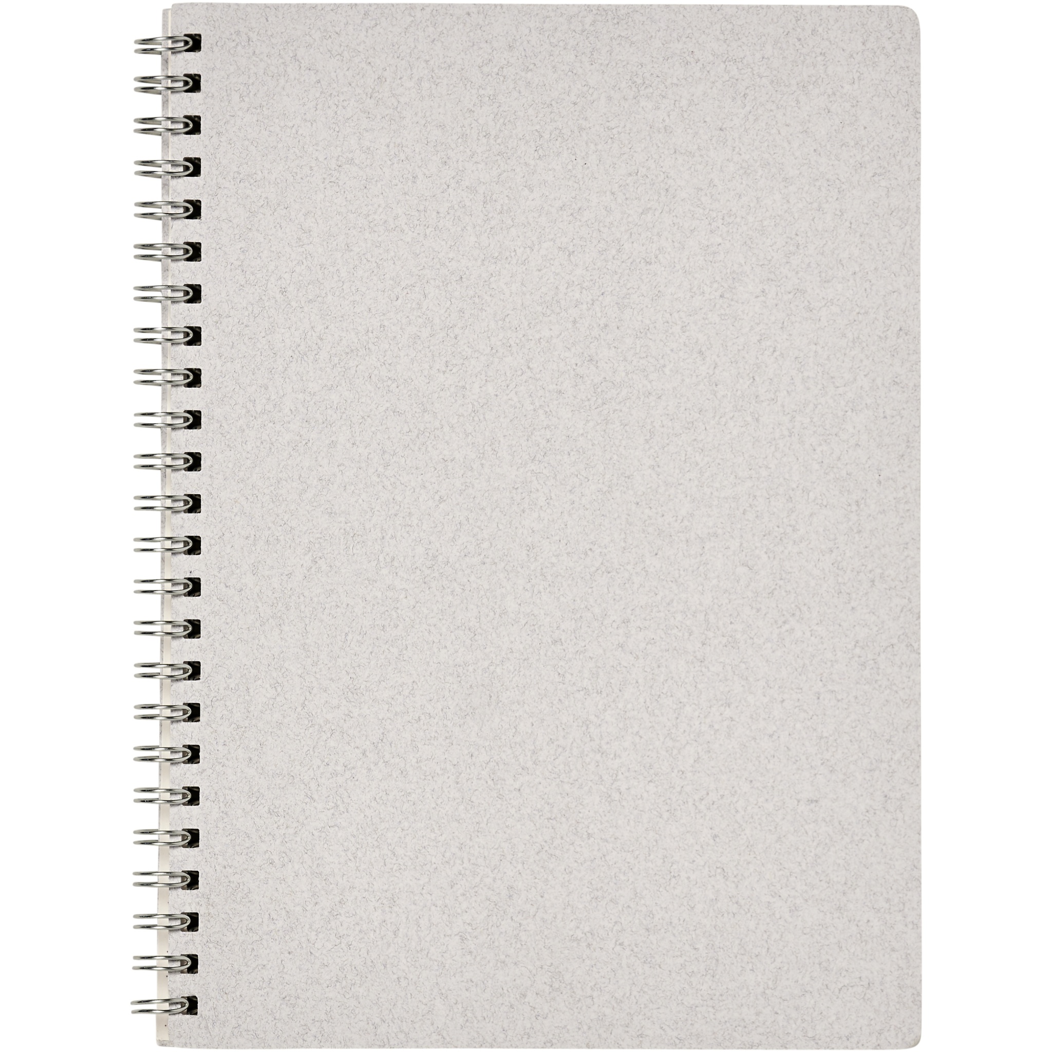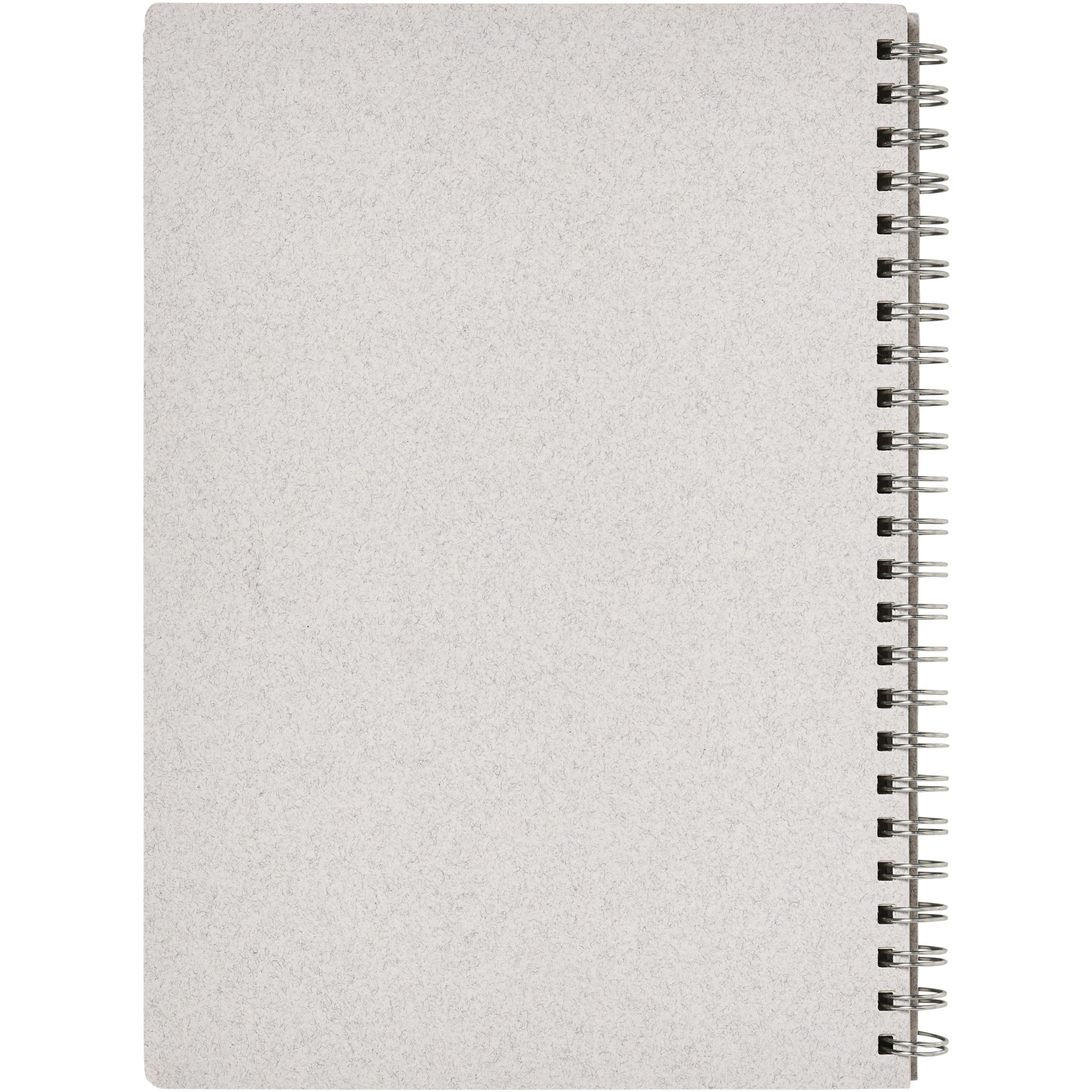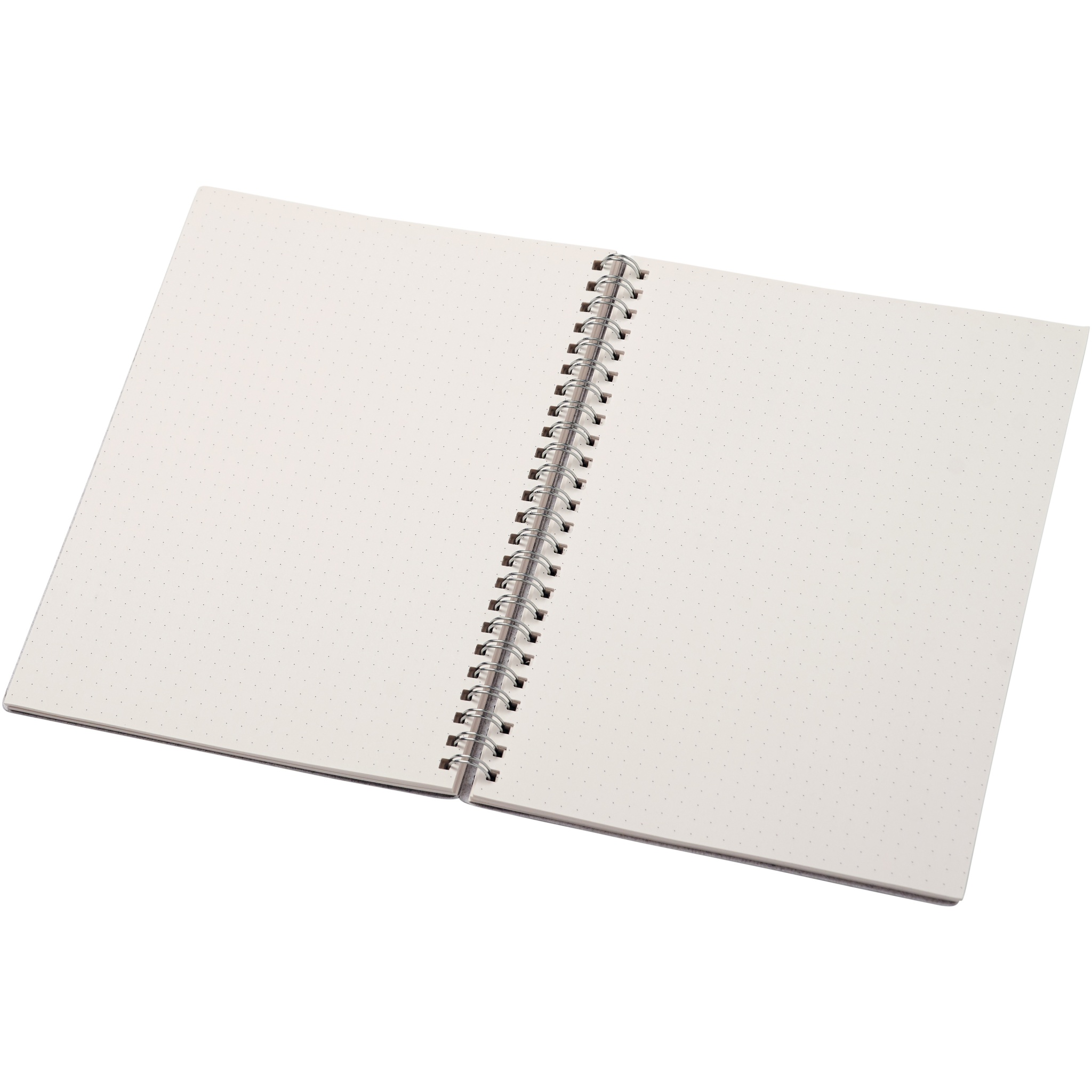 Wire-o-anteckningsbok i storlek A5 är tillverkad av ett ansvarsfullt anskaffat överdrag som innehåller bomullsrester (15 %) och återvunnet avfall från kasserade produkter (40 %). Innehåller 80 blad, 80 g/m2 100 % ansvarsfullt anskaffat papper med ett prickat rutnät. Den prickade layouten kombinerar fördelarna med sidor som är linjerade, tomma och rutade och tillhandahåller både struktur samt stimulerar kreativitet vilket gör denna anteckningsbok lämplig för flera olika typer av användare. Tack vare dess spiraler kan anteckningsboken ligga platt men även enkelt vikas ihop. Tillverkad i Italien.