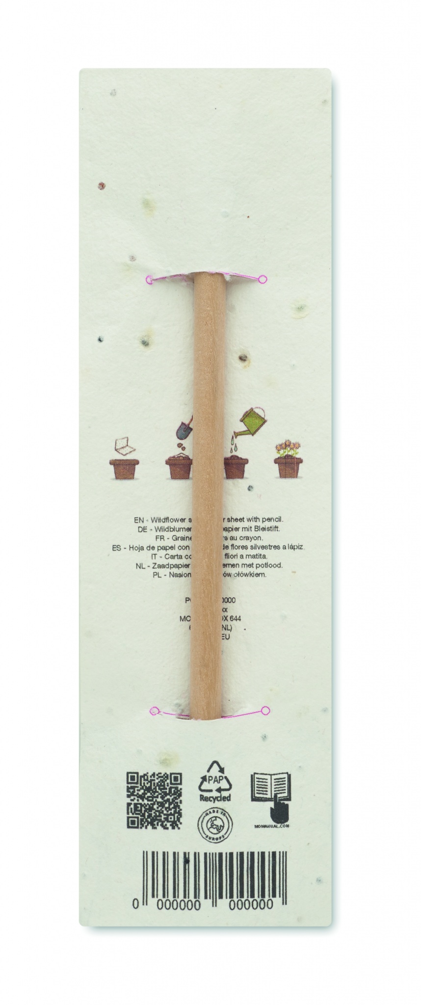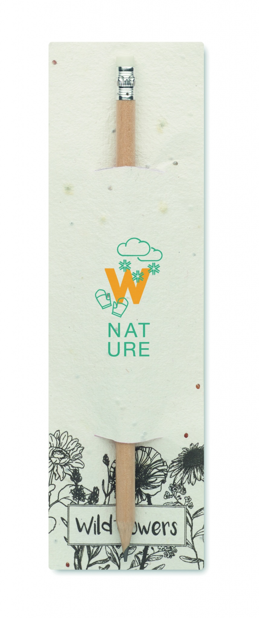 Blyertspenna i naturträ med suddgummi. I en påse med fröpapper (vildblommor).