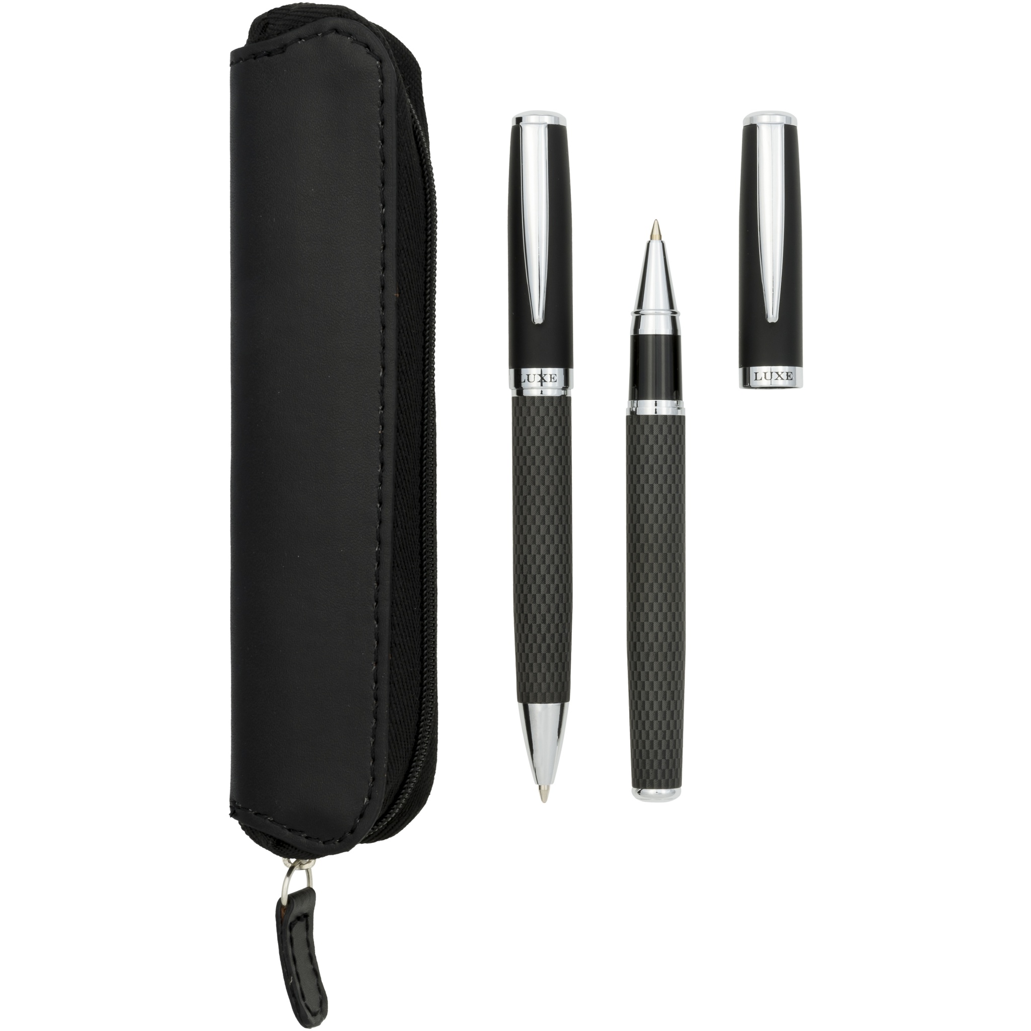 Carbon presentset med två kulspetspennor i fodral, Helt svart