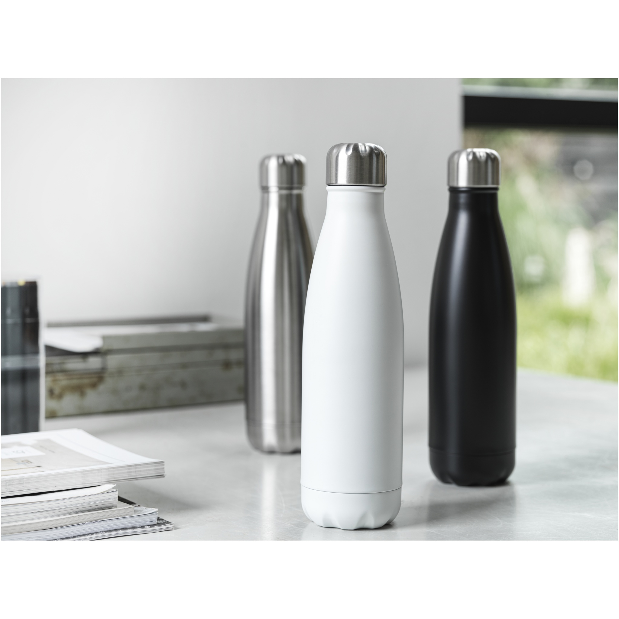 Vakuumisolerad RCS-certifierad flaska av återvunnet rostfritt stål med ikonisk design som håller drycker varma eller kalla under flera timmar. Denna snygga vattenflaska har en bas som passar i de flesta mugghållare och är en perfekt reklamartikel. Testad och godkänd enligt tysk lagstiftning om livsmedelssäkerhet (LFGB) och testad för ftalatinnehåll enligt REACH-förordningarna. Volymkapacitet 500 ml. Levereras i en presentförpackning av återvunnen kartong.