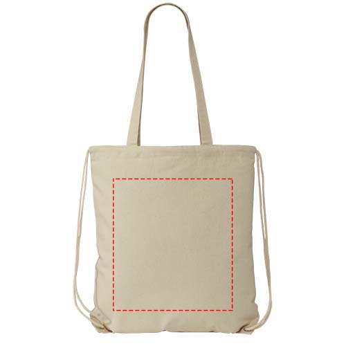Multifunktionell väska i bomull med långa handtag och dragsko som kan bäras över axeln eller som ryggsäck. Stort huvudfack med dragsko för att stängas. Kommer med två nedsläppbara handtag som är 31 cm långa. kapacitet: 1,5 L, håller för en vikt på upp till 5 kg.
