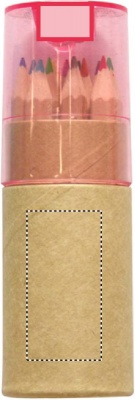 12 färgade trä blyertspennor i tub. Pennvässare i transparent lock.