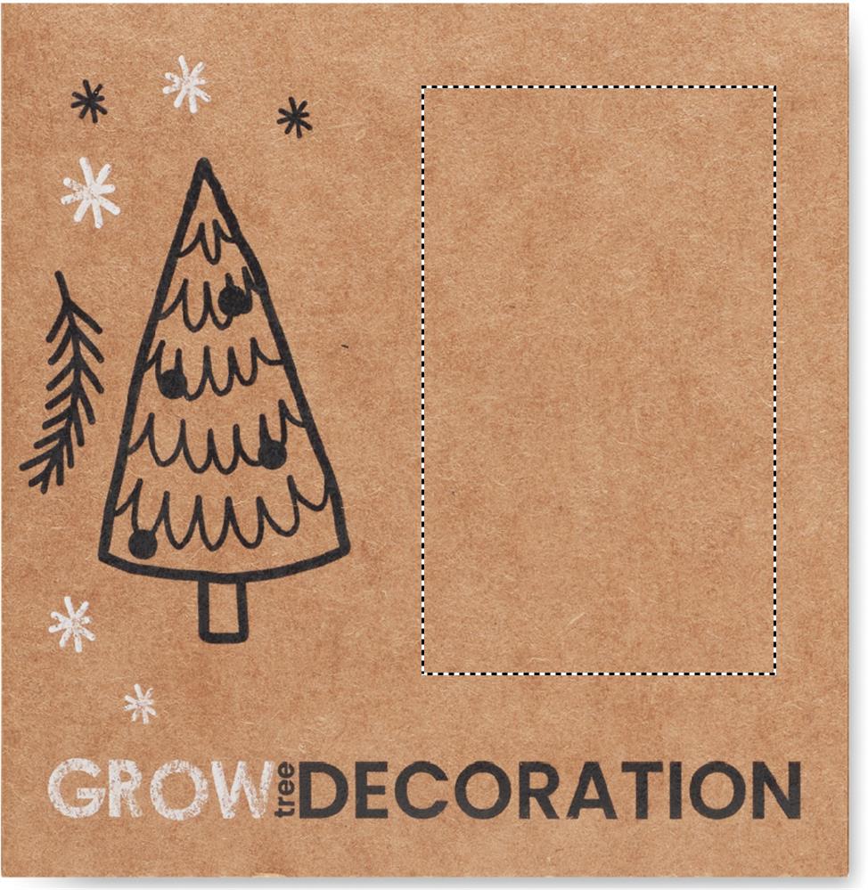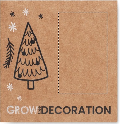 Julgransprynad i form av en träkula med jutesnöre och granfrön. Presenteras i kraftkuvert.