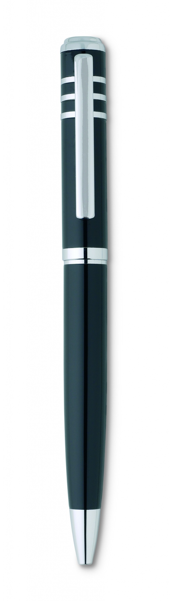 Vridbar kulpenna i lackad metall. Presentask i papp med satinbeklädd insida. Svart bläck.