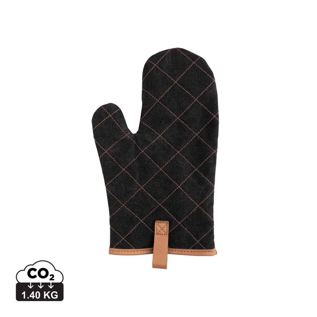 En välbehövlig följeslagare i köket, den vadderade vanten skyddar dina händer från varma föremål. Den separata tummen ger ett bra grepp, med dekorativa PU-detaljer. Tillverkad av rejäl 16oz. canvas. Levereras i presentförpackning. Maskintvätt 30 grader celsius, tvättas med liknande färger.
