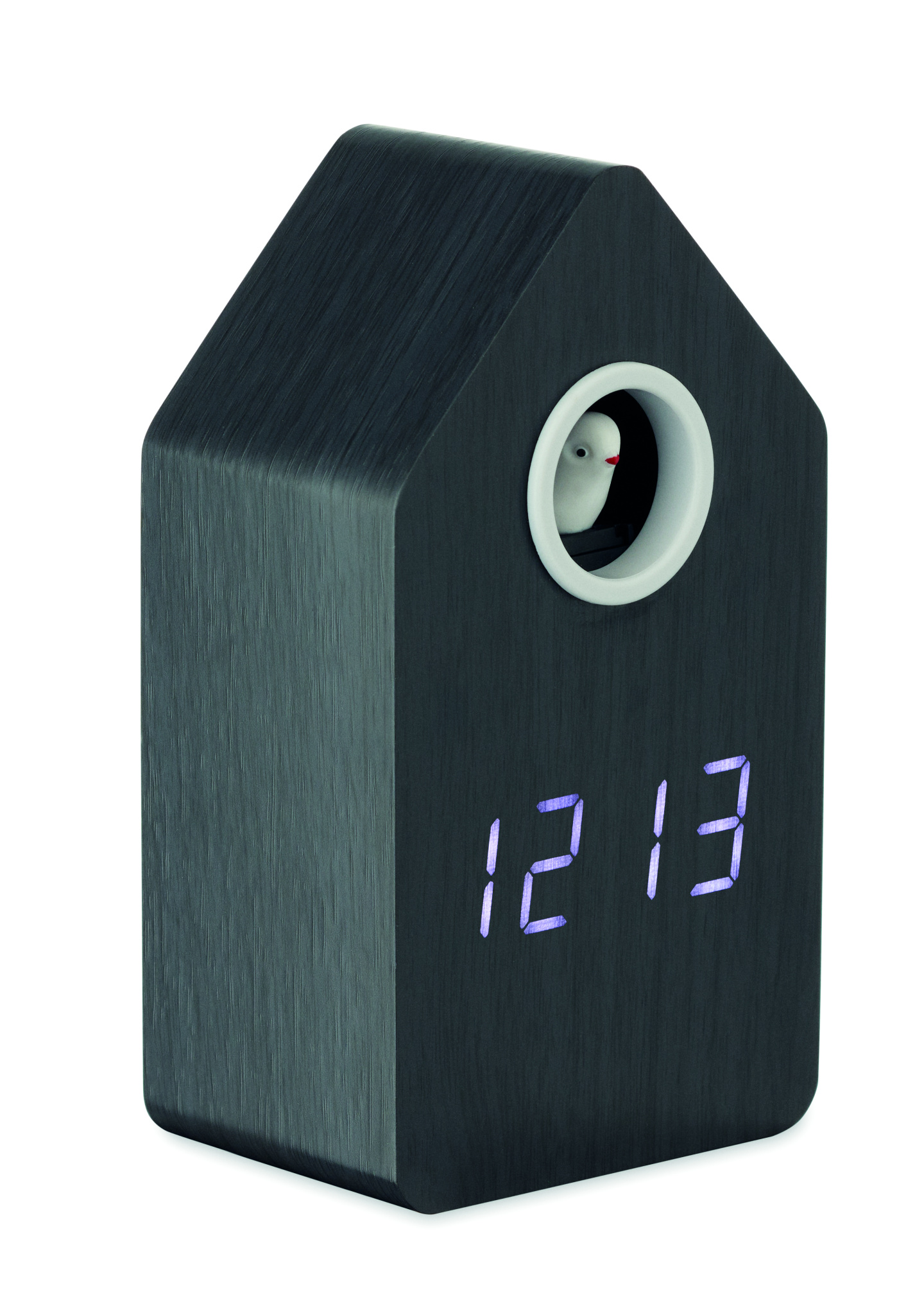 MDF-gökur med inbyggt alarm och temperaturvisning. Fågeln kommer att komma ut och den har fågelgökröst. Vit LED-display. Ljudet tystnar automatiskt mellan kl. 22.00 och 06.00. 5 minuters snooze-intervaller.