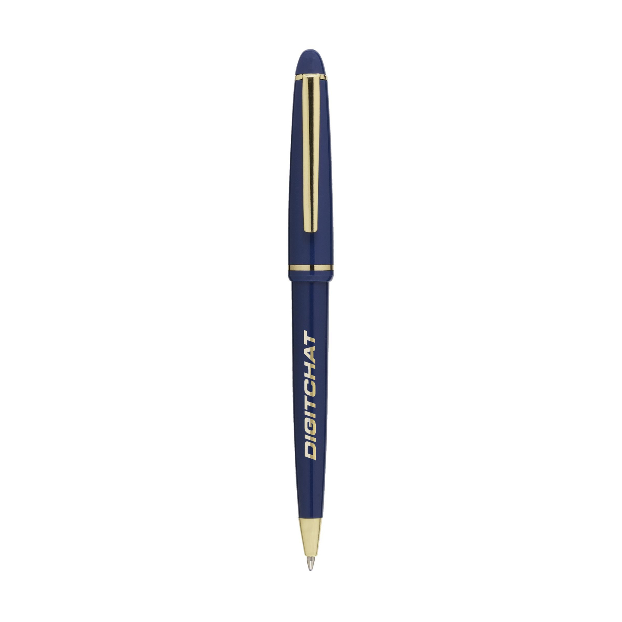 Kulspetspenna med blått bläck med polerat fat, förgylld, utsmyckad klämma och spets och vridningsverkan.