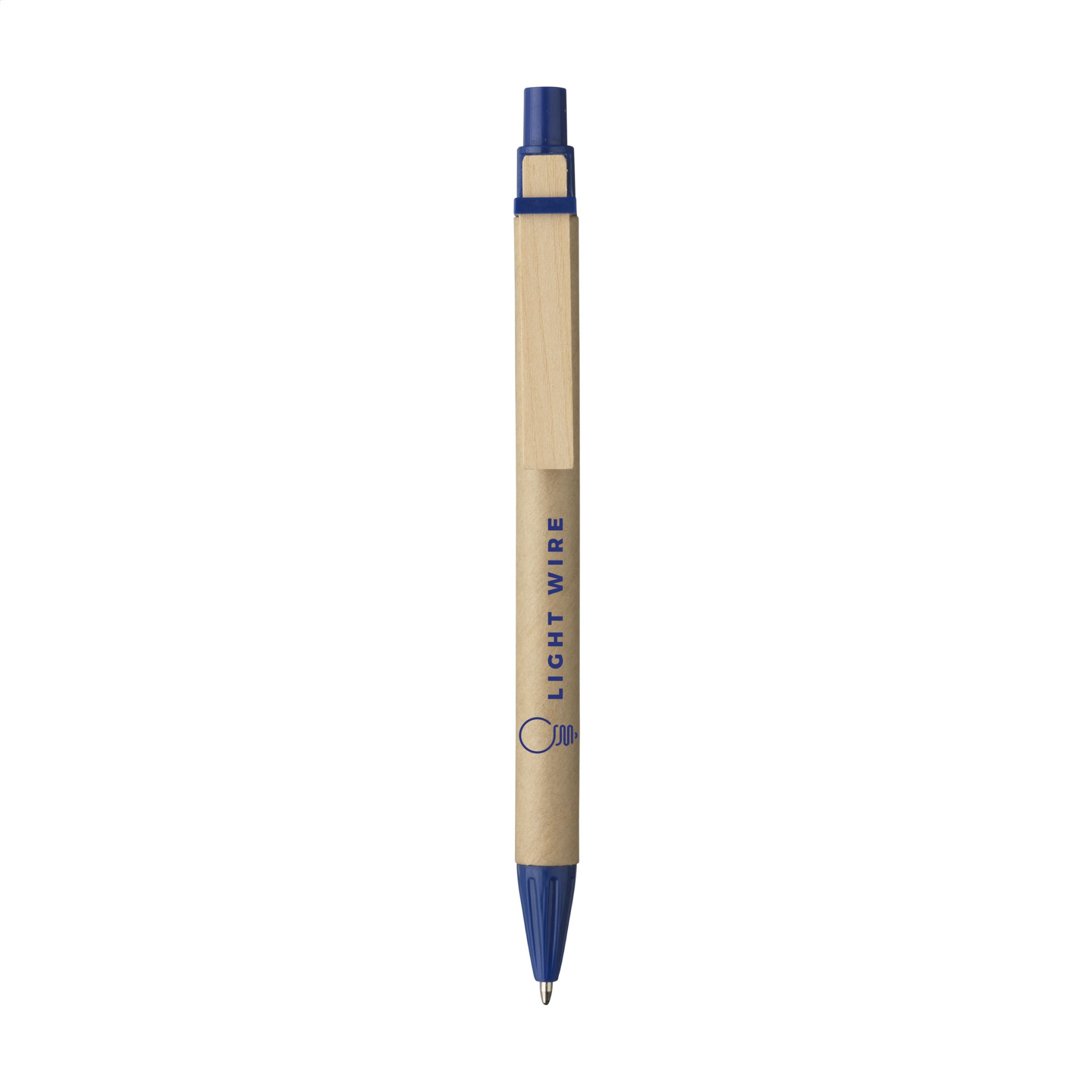 WoW! Kulspetspenna med blått bläck med hållare av återvunnen kartong, träklämma och färgade plastdetaljer.
