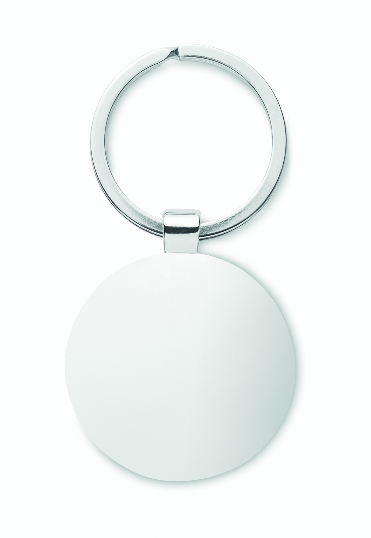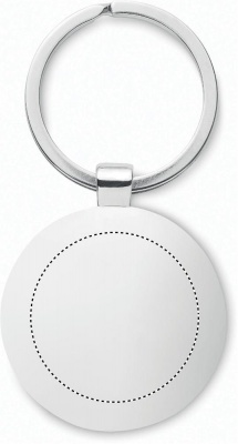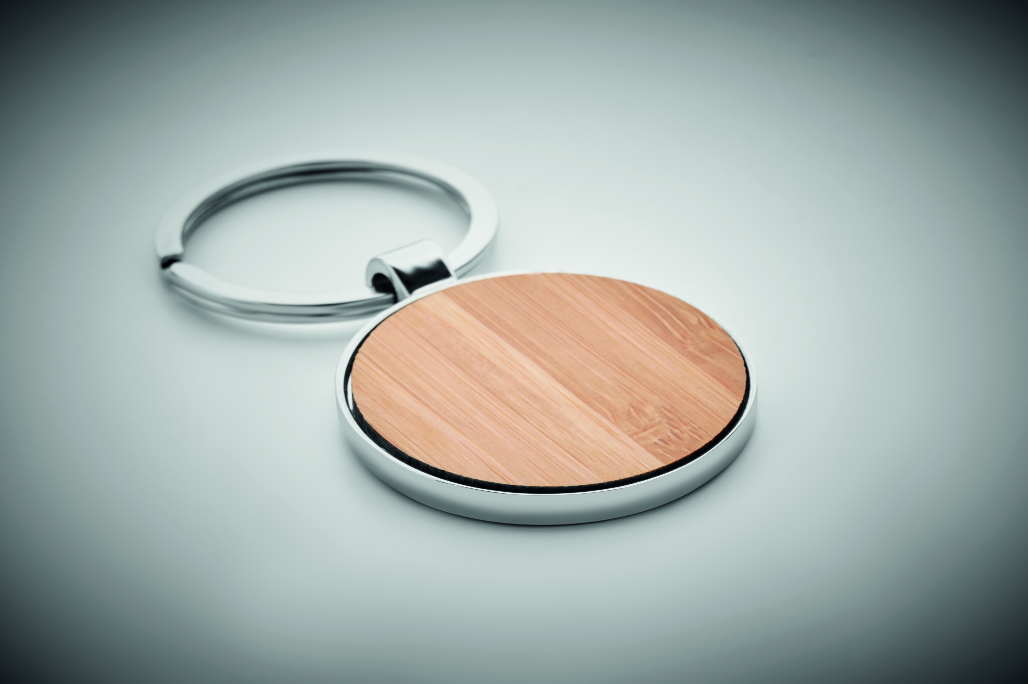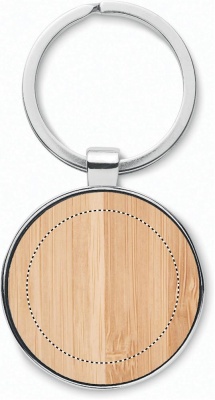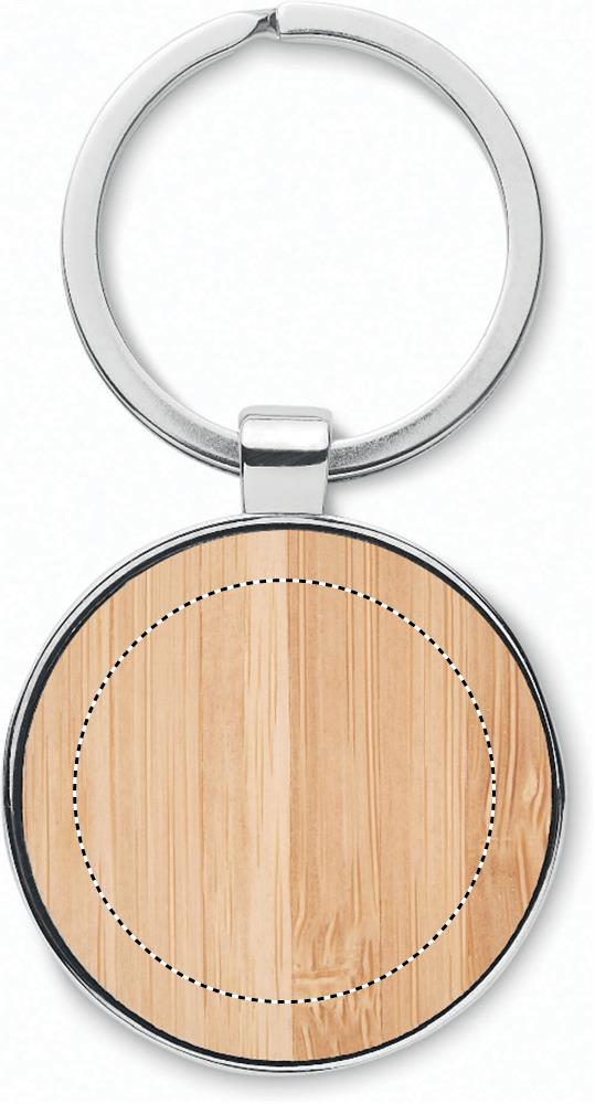 Rund nyckelring av zinklegering med bambufront. Bambu är en naturligt material och det kan finnas små variationer i färg och storlek, vilket kan påverka märkningen.