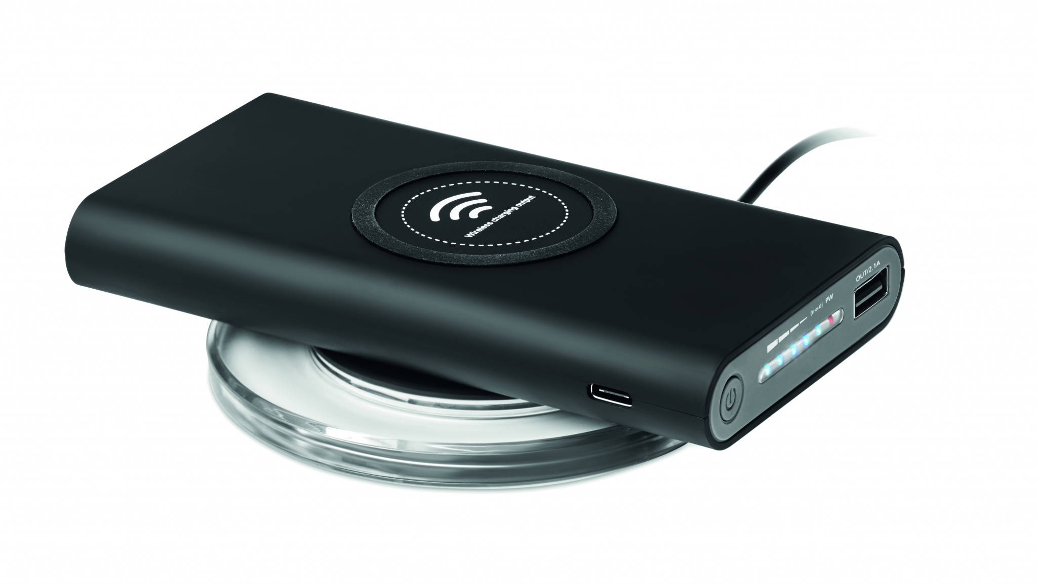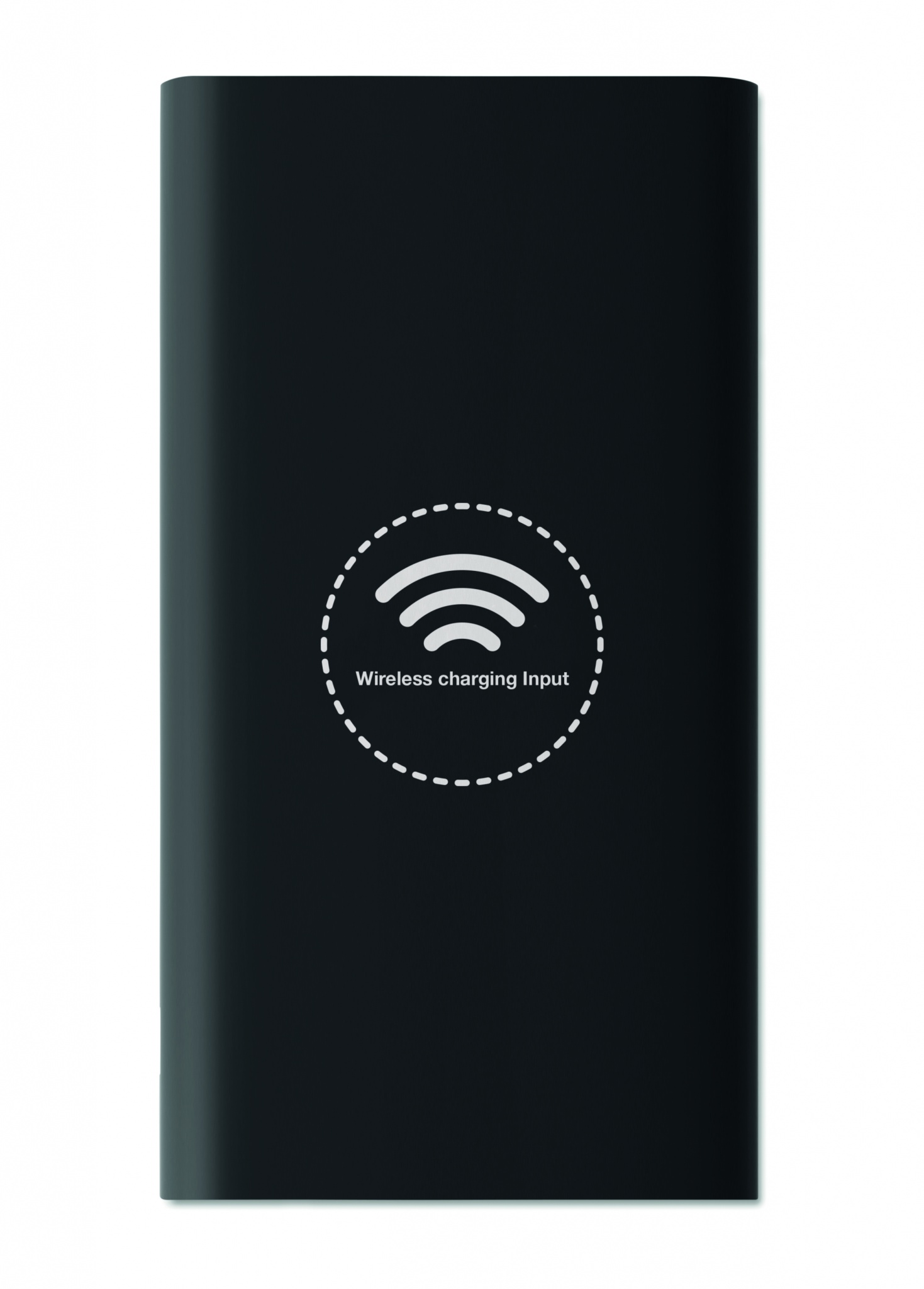 Trådlös Qi Powerbank med 8000 mAh i ABS med gummerad yta. Kan ladda mobiltelefoner 2-4 ggr eller surfplatta ca 1 ggr beroende på modell. Output DC5V / 2.1A. Har 6 LED-indikatorer. Inkluderar USB-kabel med mikro USB-kontakt.