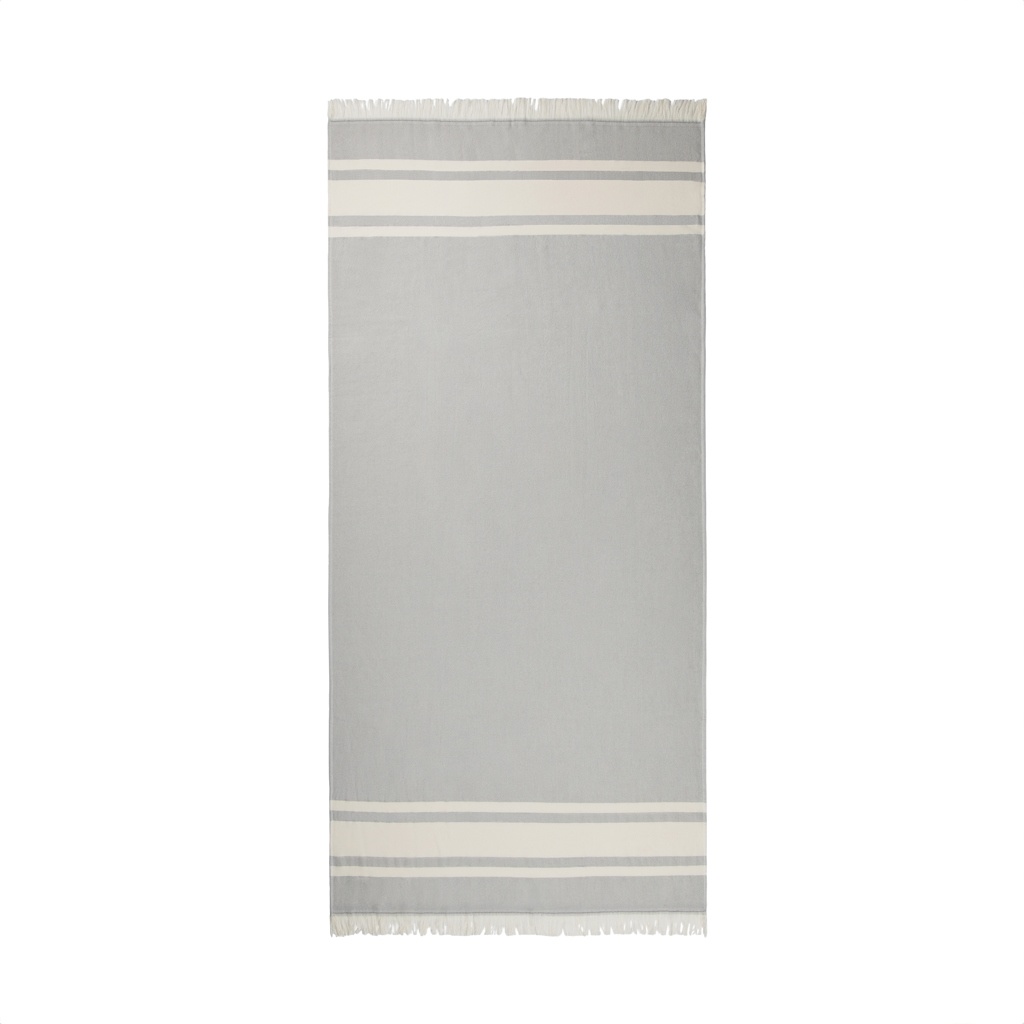 Hamam handduk designad med två olika typer av textur, den ena sidan i frotté och den andra sidan slät. Den tvåsidiga designen gör handduken till den ultimata följeslagaren för stunder på stranden, vid poolen eller under utomhusäventyr. Den erbjuder en utmärkt absorptionsförmåga och snabb torkning. Handduken är tillverkad av 75% bomull, 25% polyester och med en tjocklek på 360 g/m2. Mått 180x80 cm exklusive fransar på 5 cm. OEKO-TEX® STANDARD 100. 09.HIN.68091. Hohenstein HTTI.